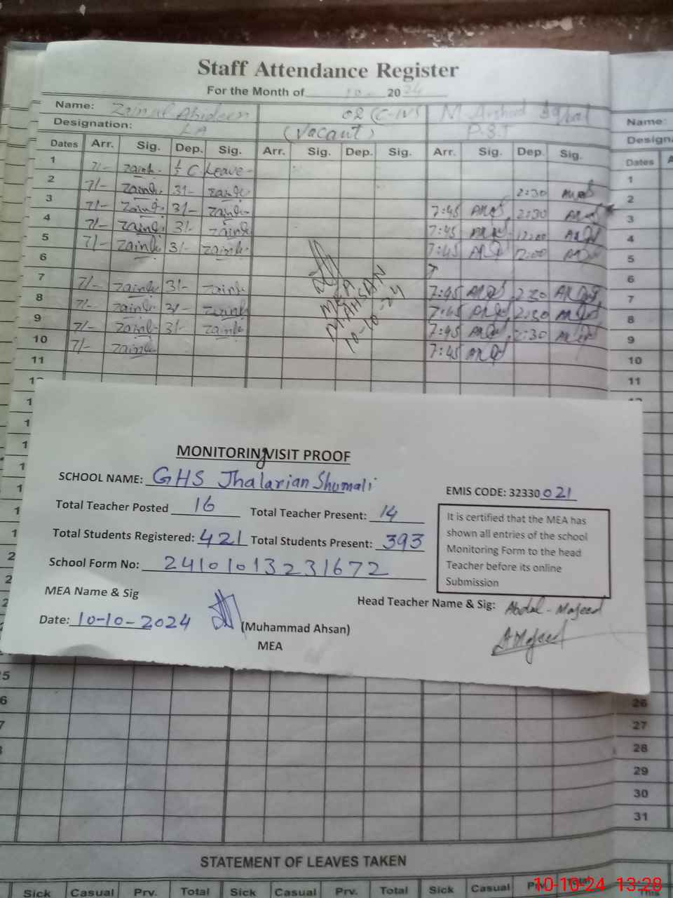| Attendance Register | Head Teacher | MEA with School | Visit Proof |