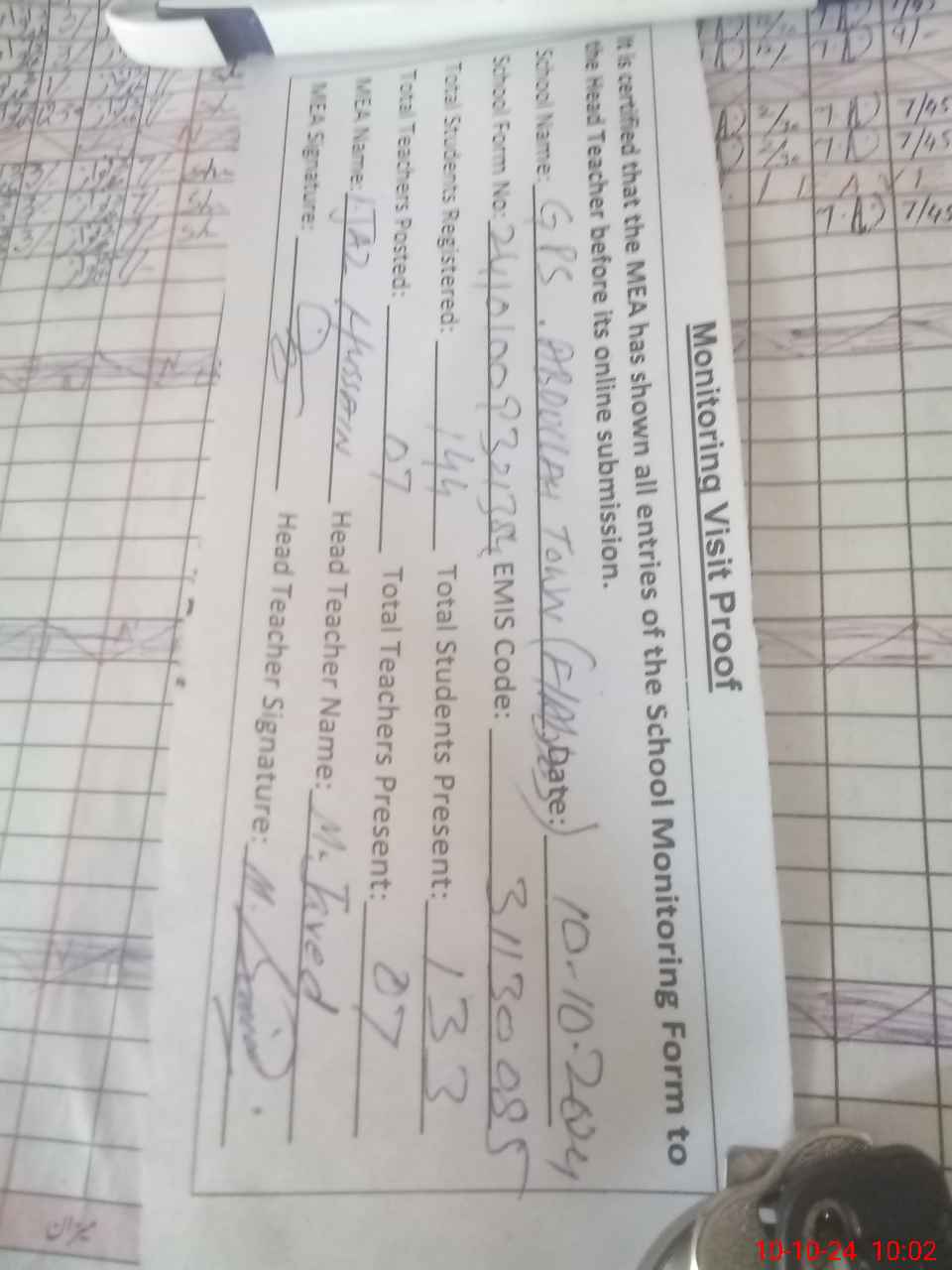 | Certified that this School was Inspected by the Undersigned MEA/DMO Today and the Information Stated Above is as Per Record. | |||||