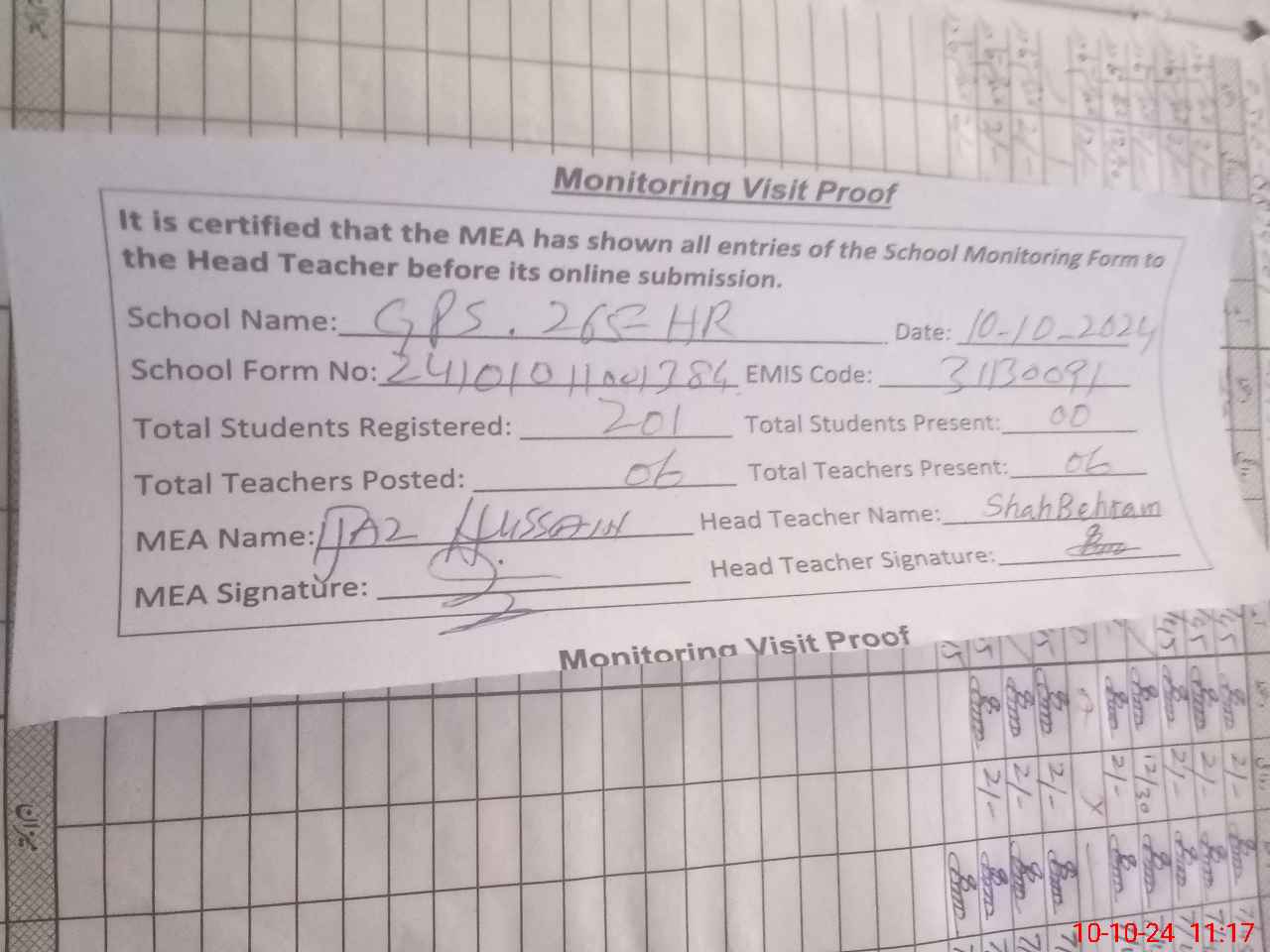 | Attendance Register | Head Teacher | MEA with School | Visit Proof |
