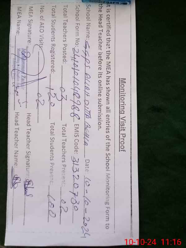| EMIS Code: 31320730 | Name of School: GGPS ALLAH DITTA BEHLA | |||