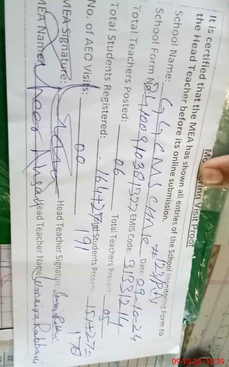 | Certified that this School was Inspected by the Undersigned MEA/DMO Today and the Information Stated Above is as Per Record. | |||||