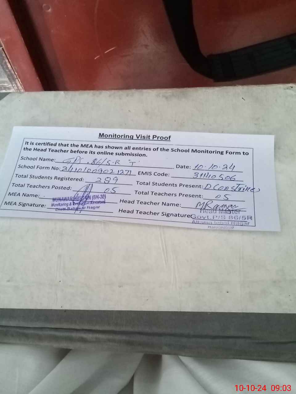 | EMIS Code: 31140506 | Name of School: GPS CHAK NO 86/5-R T | |||