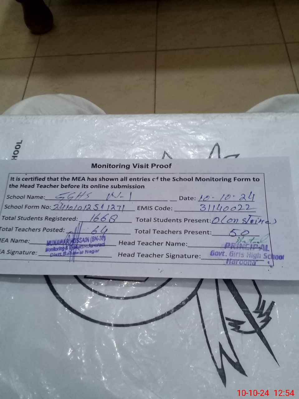 | EMIS Code: 31140022 | Name of School: GGHS HAROON ABAD WARD NO. 1 | |||