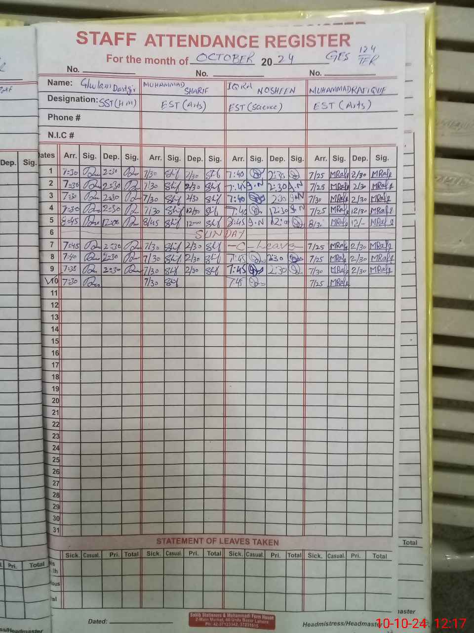 | CNIC | Full Name | Designation | R/C | Absence During Last Calender Month |