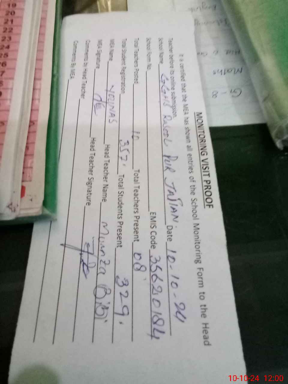 | Attendance Register | Head Teacher | MEA with School | Visit Proof |