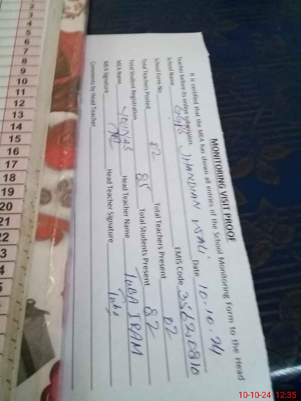 | Name: TO**** IR**** Designation: (School Headmaster's/Headmistress's) ESE Sci-math Phone/Cell Number: 03**** |