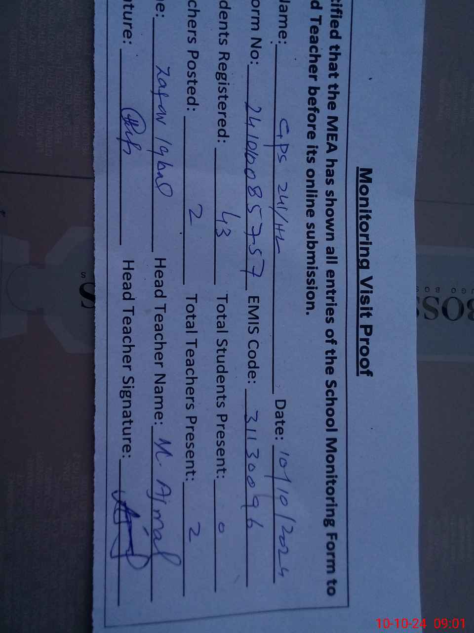 | Monitoring Date: 10-10-2024 | Start Time: 10-10-2024 08:44 AM | End Time: 10-10-2024 09:02 AM | Name of MEA: Za**** Iq**** BN**** | |