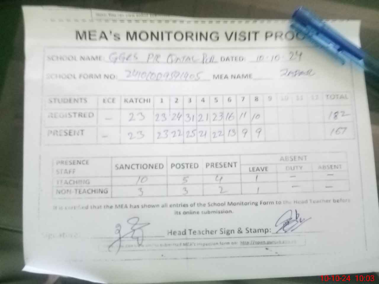 | Attendance Register | Head Teacher | MEA with School | Visit Proof |