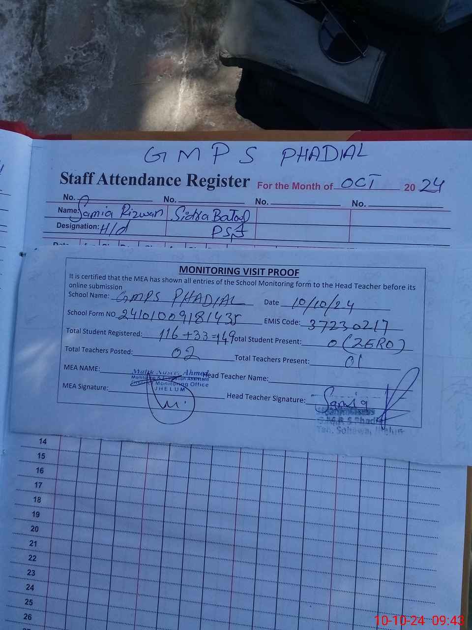 | Attendance Register | Head Teacher | MEA with School | Visit Proof |