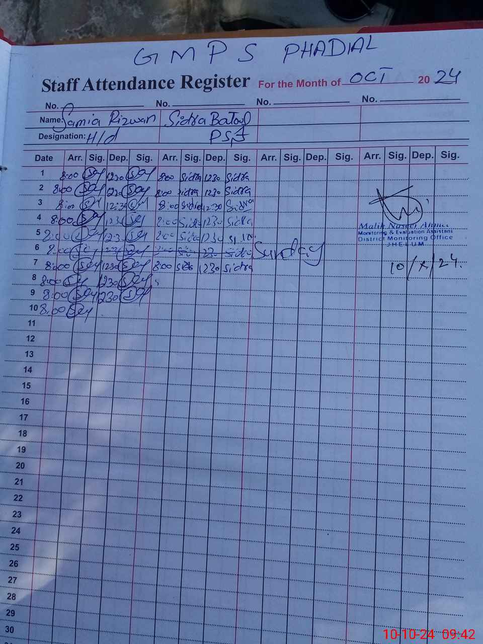 | Monitoring Date: 10-10-2024 | Start Time: 10-10-2024 09:18 AM | End Time: 10-10-2024 09:43 AM | Name of MEA: Na**** Ah**** | |
