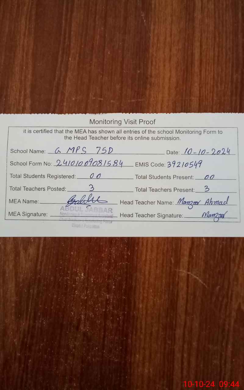 | EMIS Code: 39210549 | Name of School: GMPS 75/D | |||