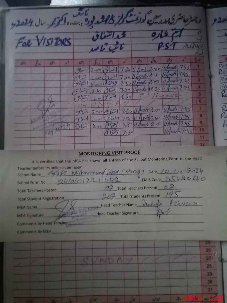 | Attendance Register | Head Teacher | MEA with School | Visit Proof |