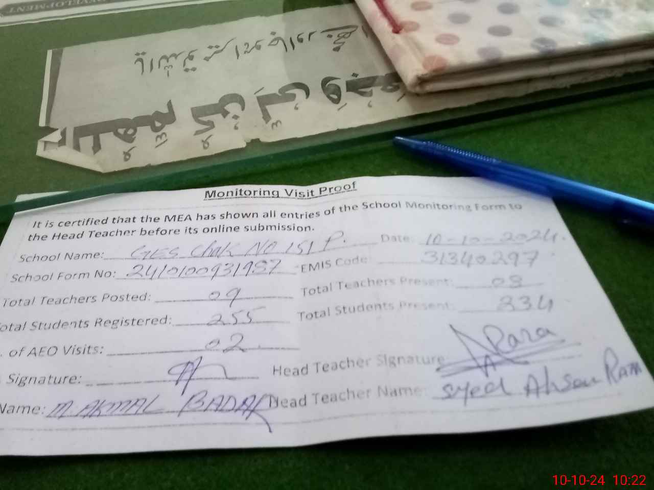 | Certified that this School was Inspected by the Undersigned MEA/DMO Today and the Information Stated Above is as Per Record. | |||||