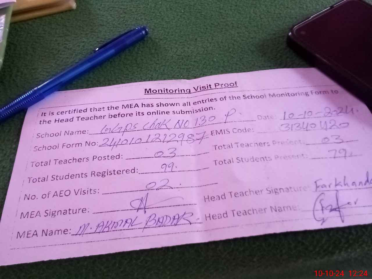 | Monitoring Date: 10-10-2024 | Start Time: 10-10-2024 12:11 PM | End Time: 10-10-2024 12:37 PM | Name of MEA: Mu**** Ak**** Ba**** | |