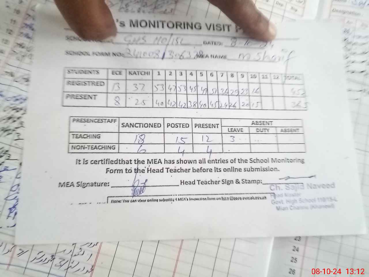 | Attendance Register | Head Teacher | MEA with School | Visit Proof |