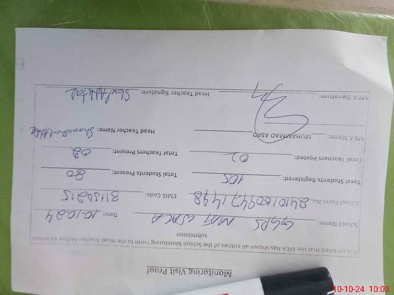 | Attendance Register | Head Teacher | MEA with School | Visit Proof |