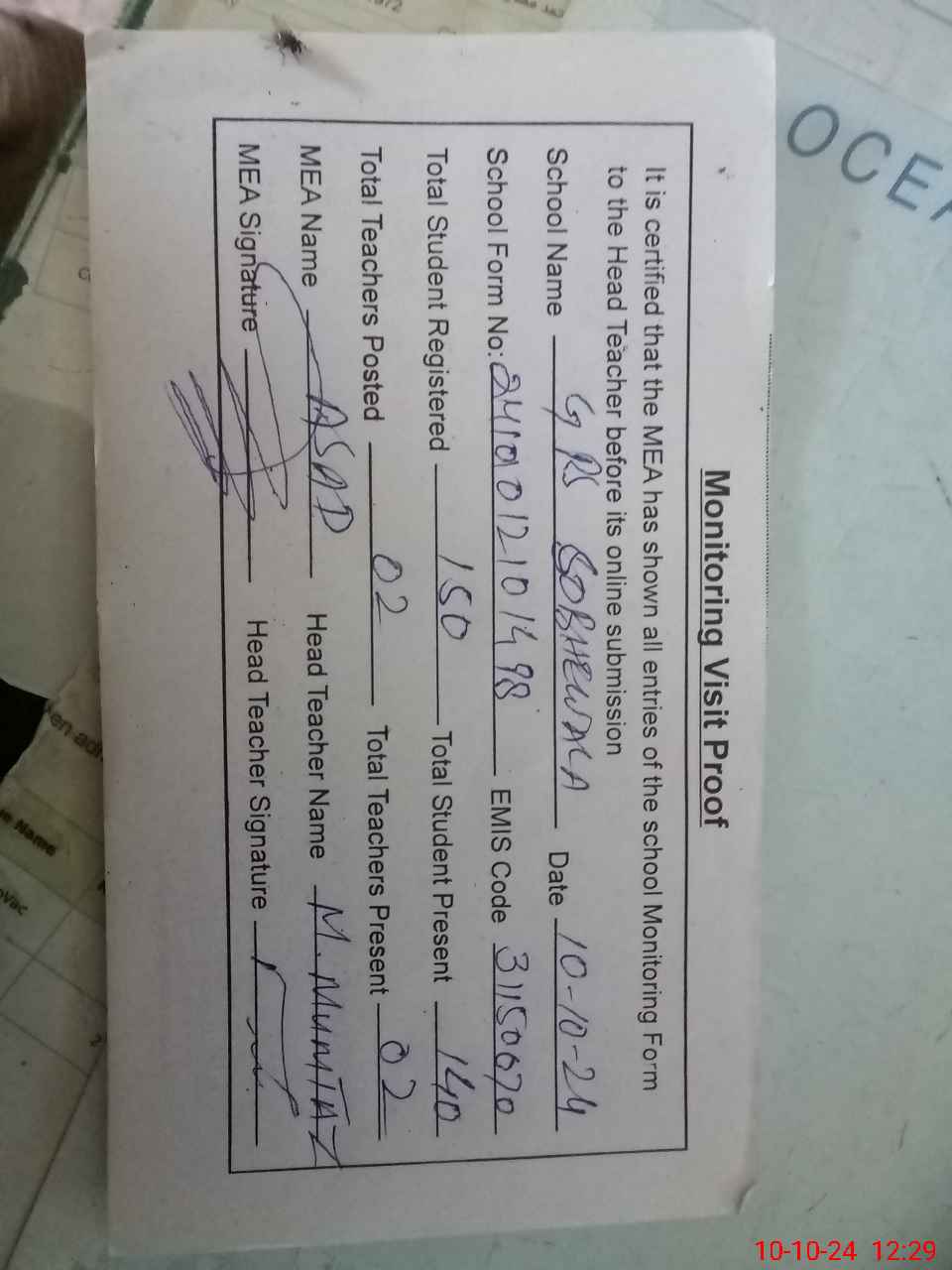 | Attendance Register | Head Teacher | MEA with School | Visit Proof |