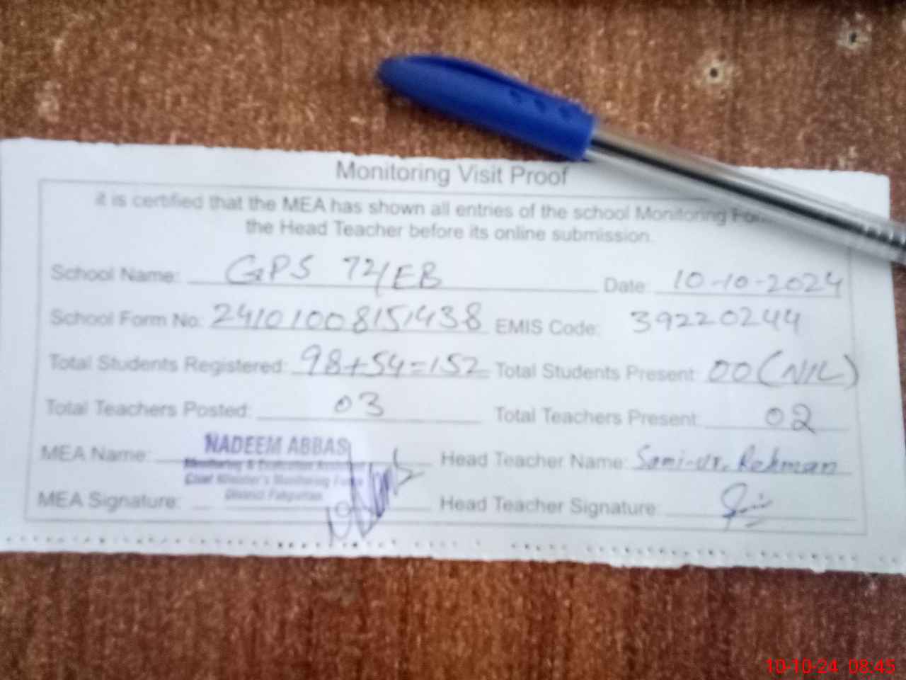 | Attendance Register | Head Teacher | MEA with School | Visit Proof |