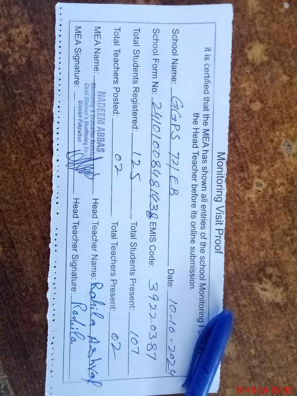 | Certified that this School was Inspected by the Undersigned MEA/DMO Today and the Information Stated Above is as Per Record. | |||||