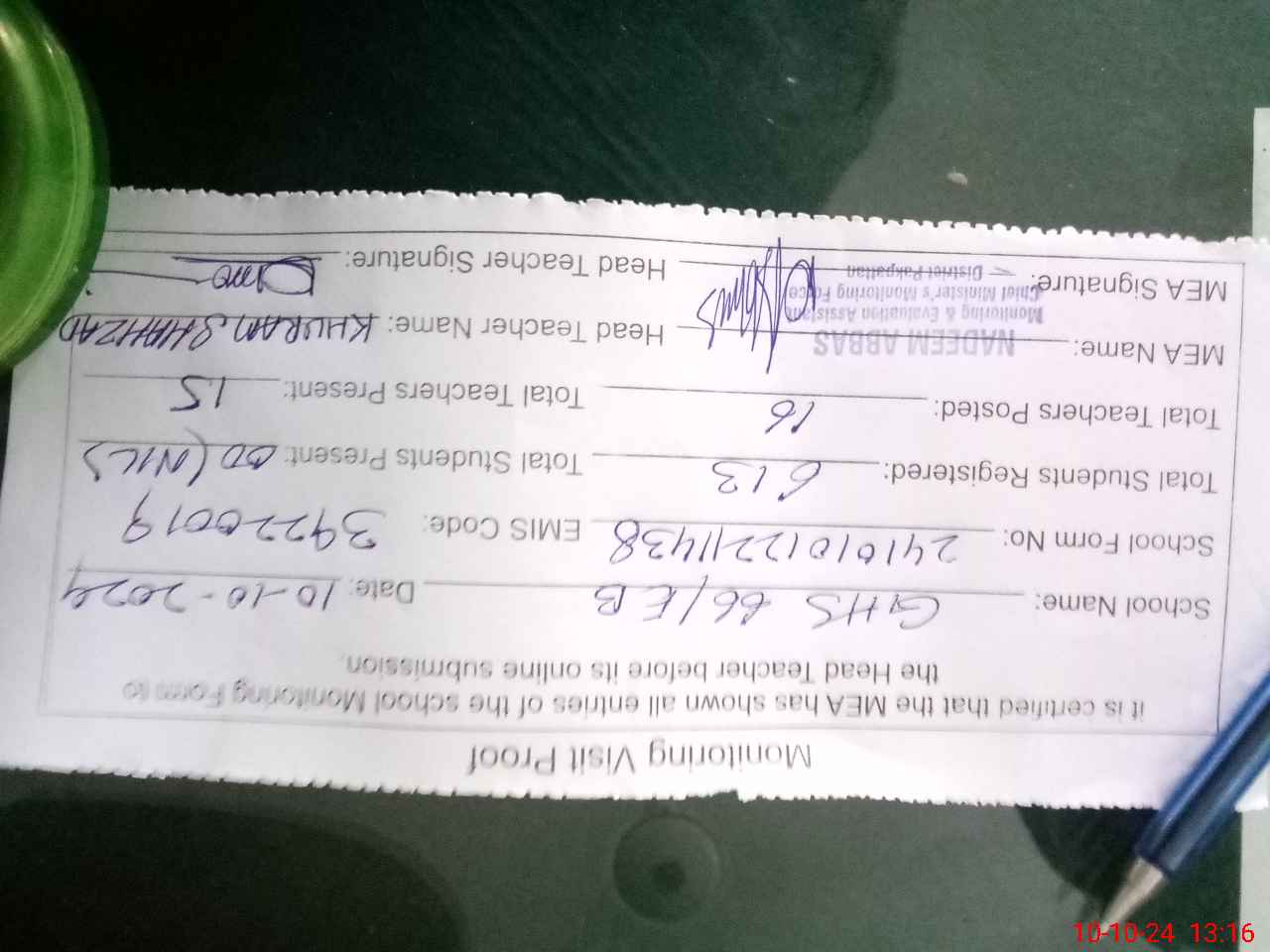 | Certified that this School was Inspected by the Undersigned MEA/DMO Today and the Information Stated Above is as Per Record. | |||||