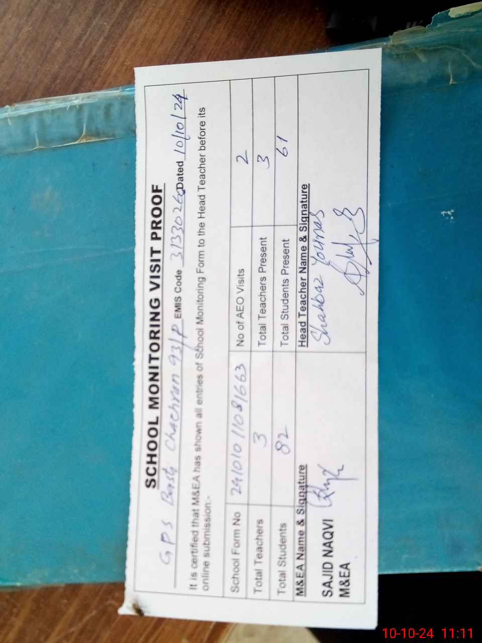 | Attendance Register | Head Teacher | MEA with School | Visit Proof |