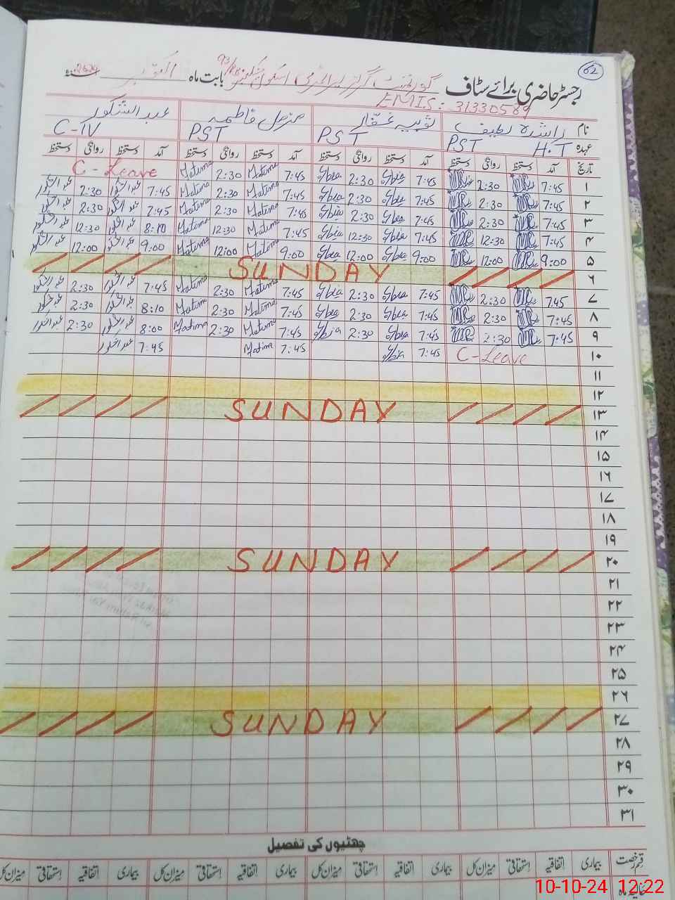 | CNIC | Full Name | Designation | R/C | Absence During Last Calender Month |