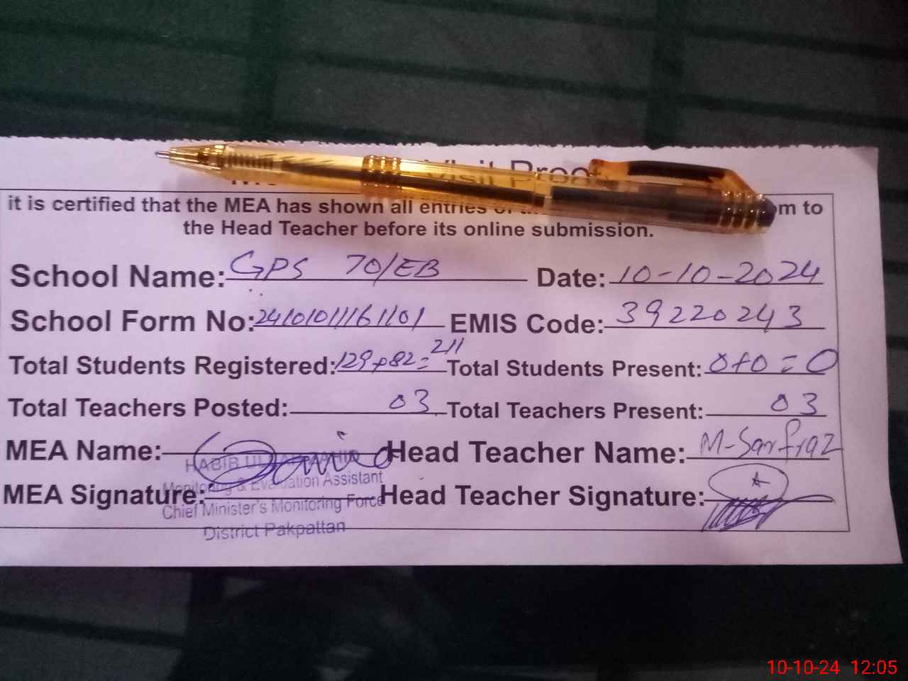| Certified that this School was Inspected by the Undersigned MEA/DMO Today and the Information Stated Above is as Per Record. | |||||