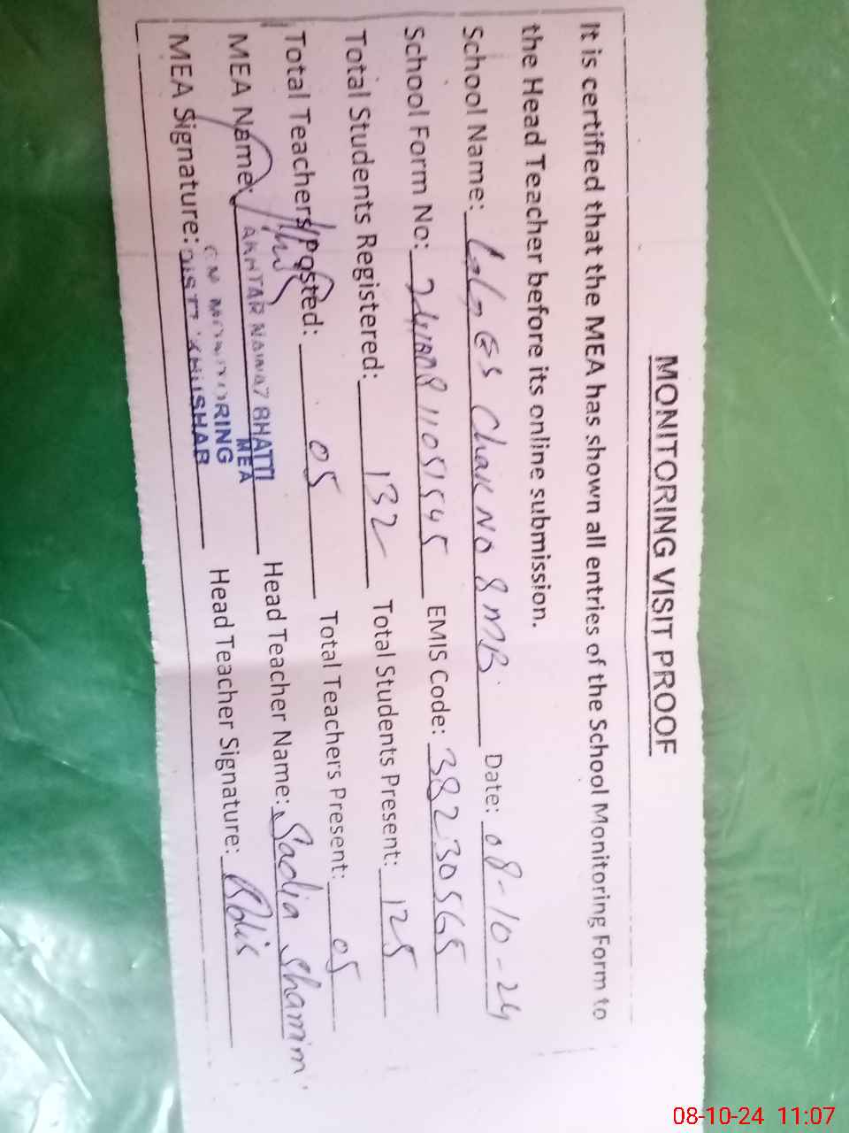 | Certified that this School was Inspected by the Undersigned MEA/DMO Today and the Information Stated Above is as Per Record. | |||||