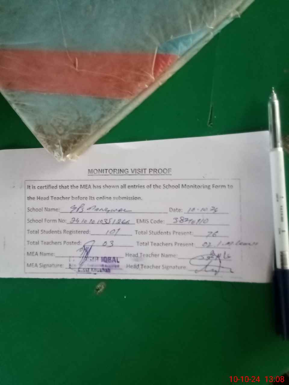 | Certified that this School was Inspected by the Undersigned MEA/DMO Today and the Information Stated Above is as Per Record. | |||||