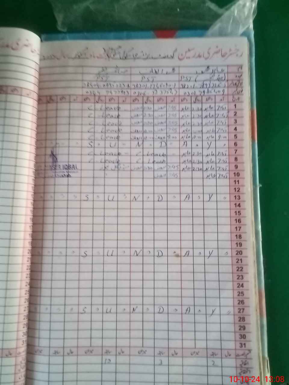 | CNIC | Full Name | Designation | R/C | Absence During Last Calender Month |