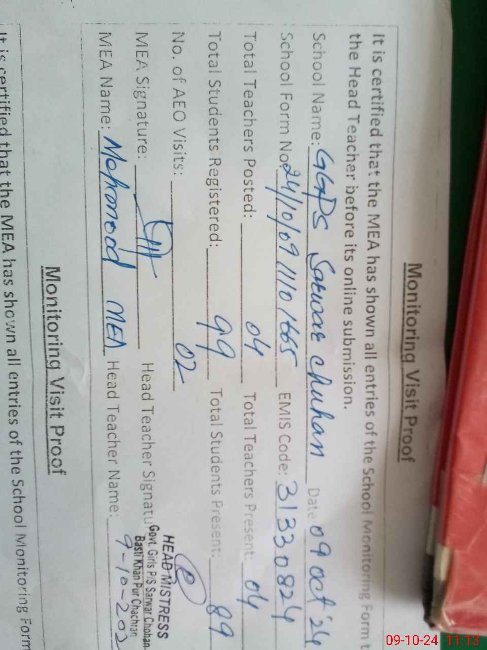 | Attendance Register | Head Teacher | MEA with School | Visit Proof |