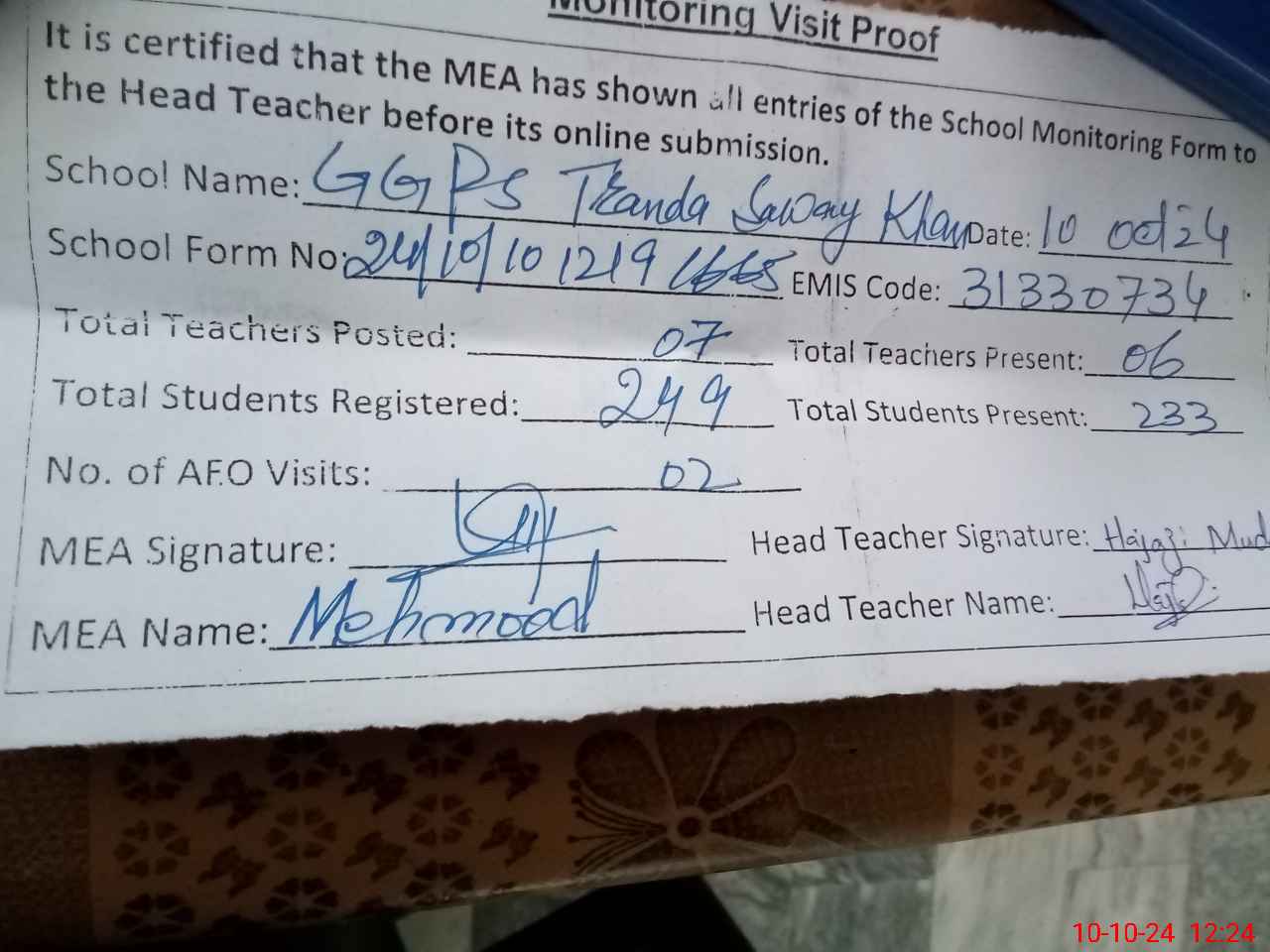 | Certified that this School was Inspected by the Undersigned MEA/DMO Today and the Information Stated Above is as Per Record. | |||||