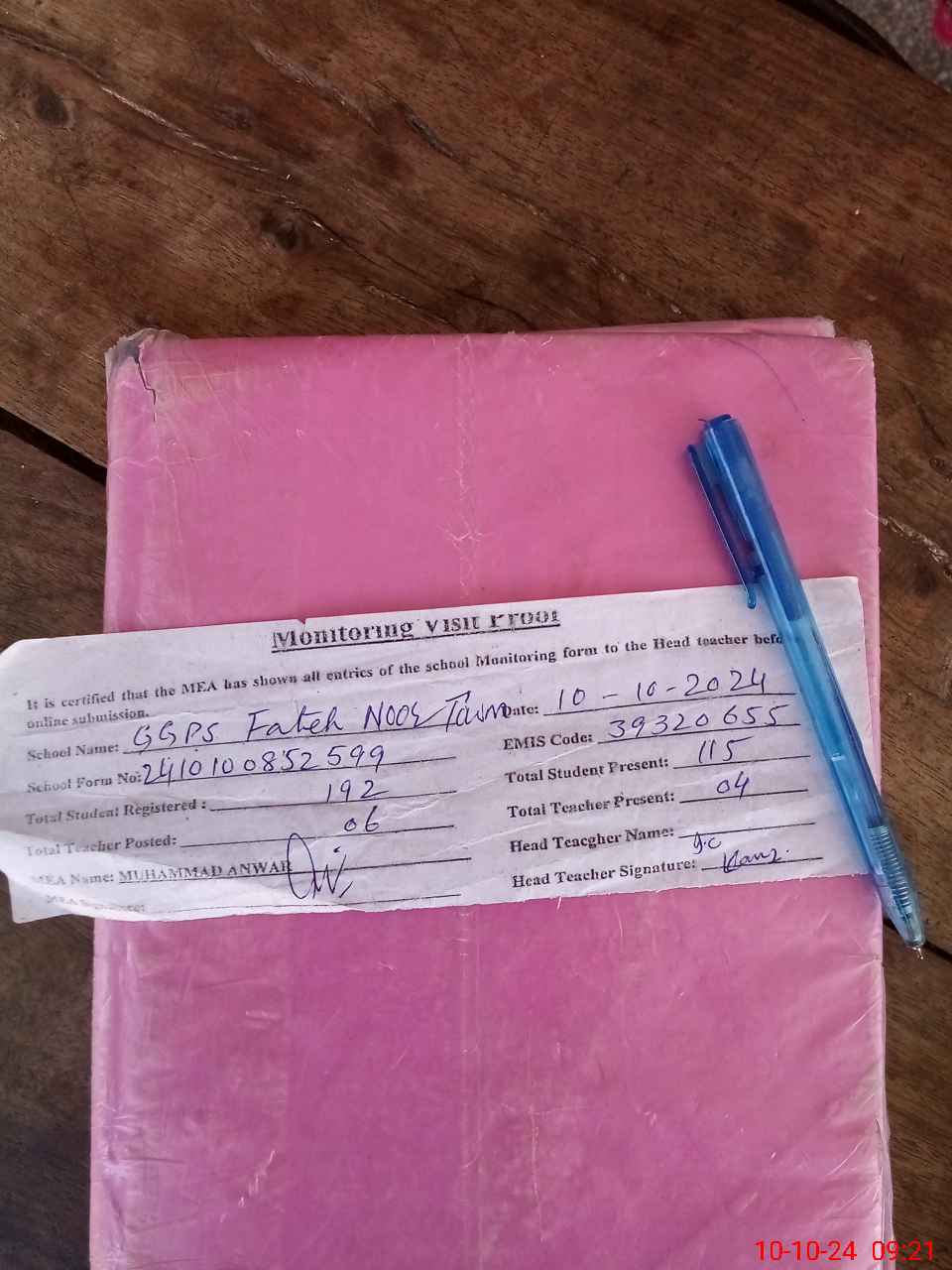 | Attendance Register | Head Teacher | MEA with School | Visit Proof |