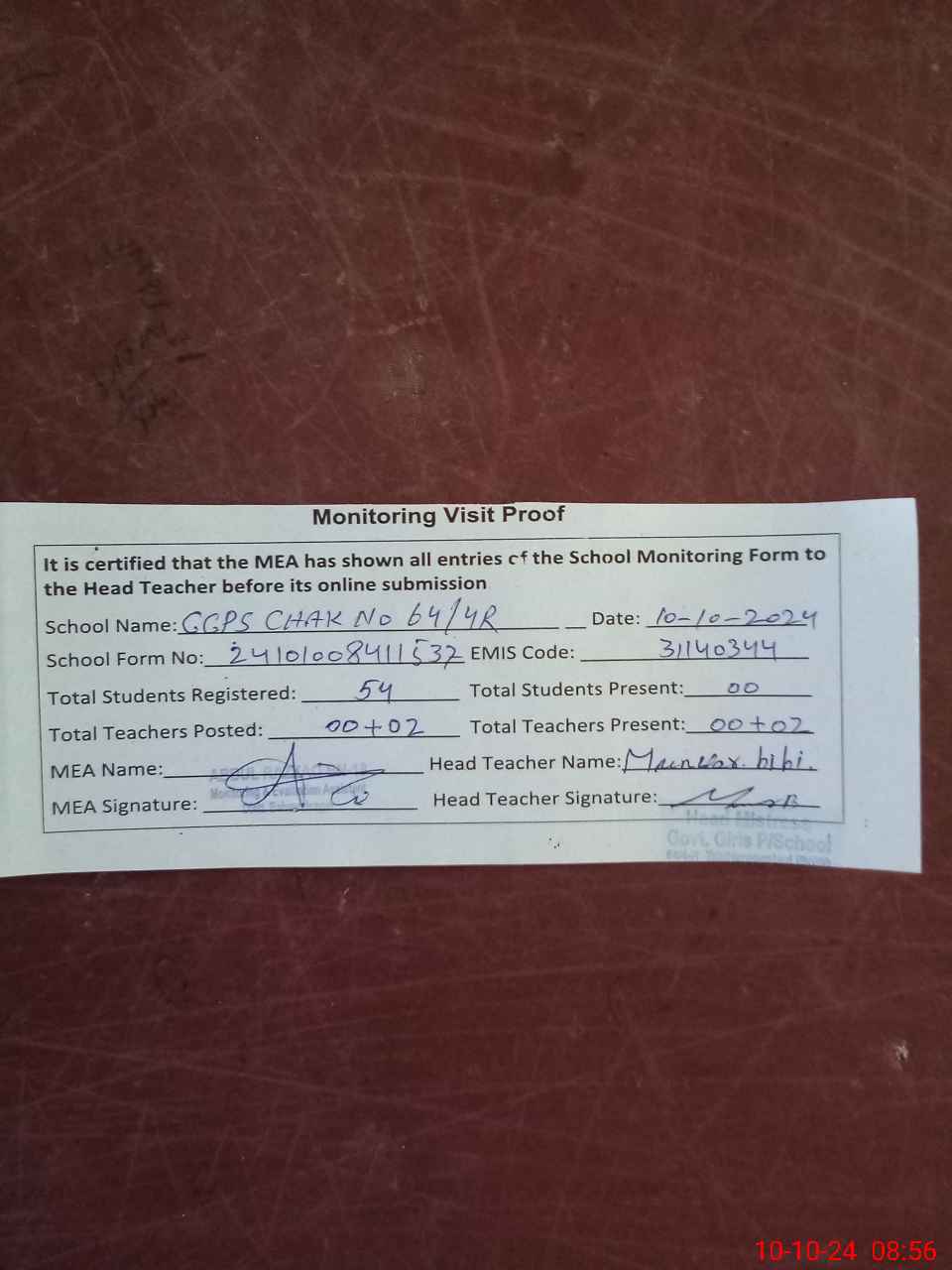 | EMIS Code: 31140344 | Name of School: GGPS CHAK NO 64/4-R | |||