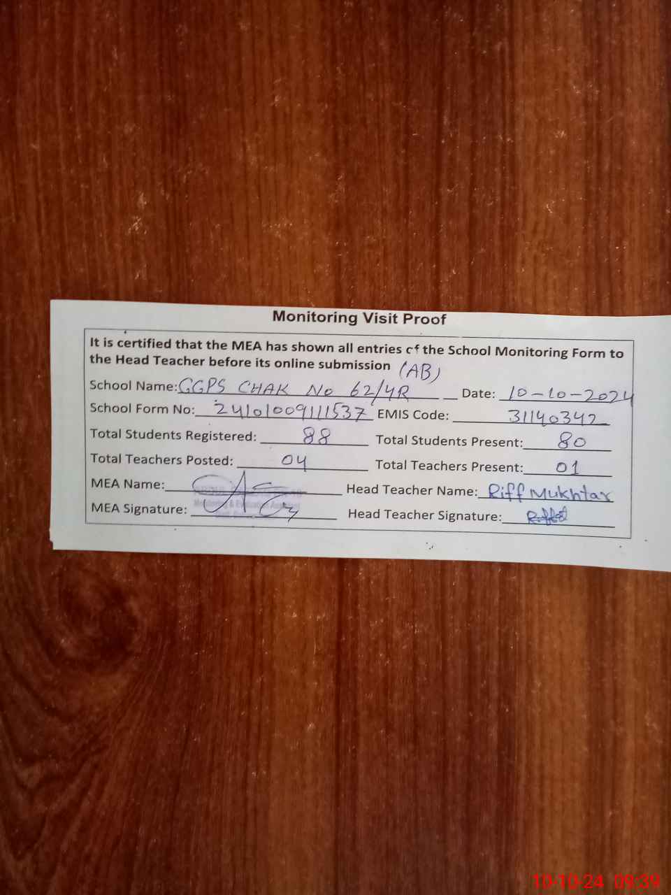 | EMIS Code: 31140342 | Name of School: GGPS CHAK 62/4-R AB | |||