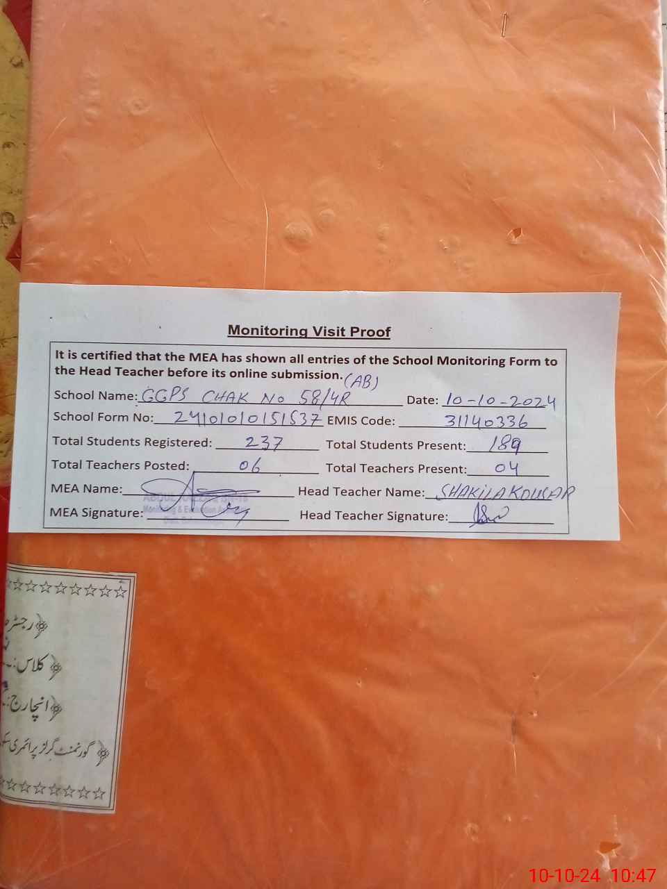| Attendance Register | Head Teacher | MEA with School | Visit Proof |
