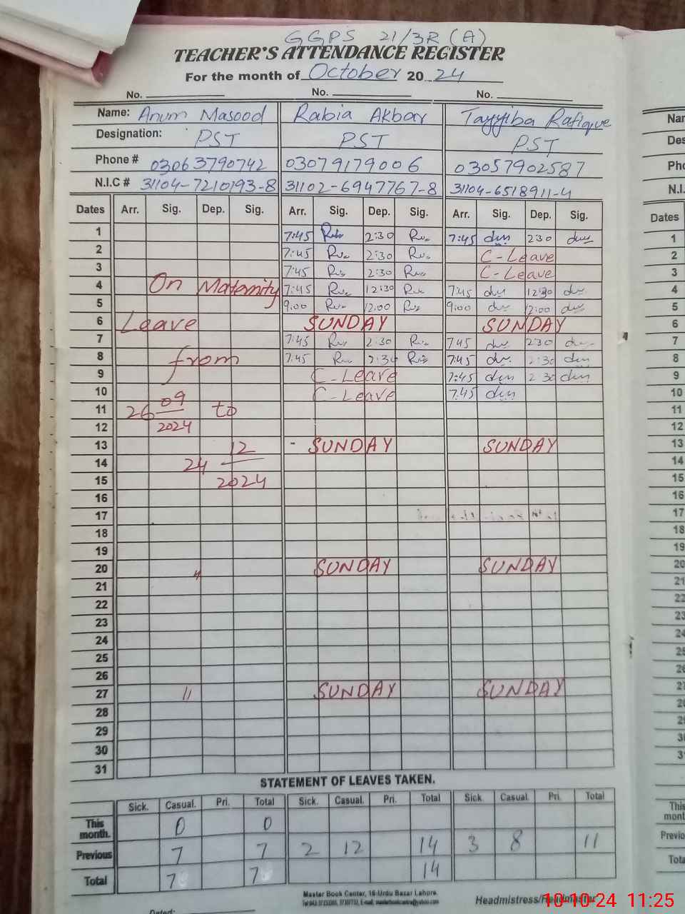 | 31**** | An**** Ma**** | PST | Regular | 7 | 0 | 0 | 5 | 0 | 0 | 0 | 0 | 2 | Maternity |