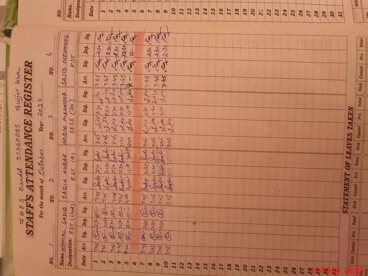 | CNIC | Full Name | Designation | R/C | Absence During Last Calender Month |