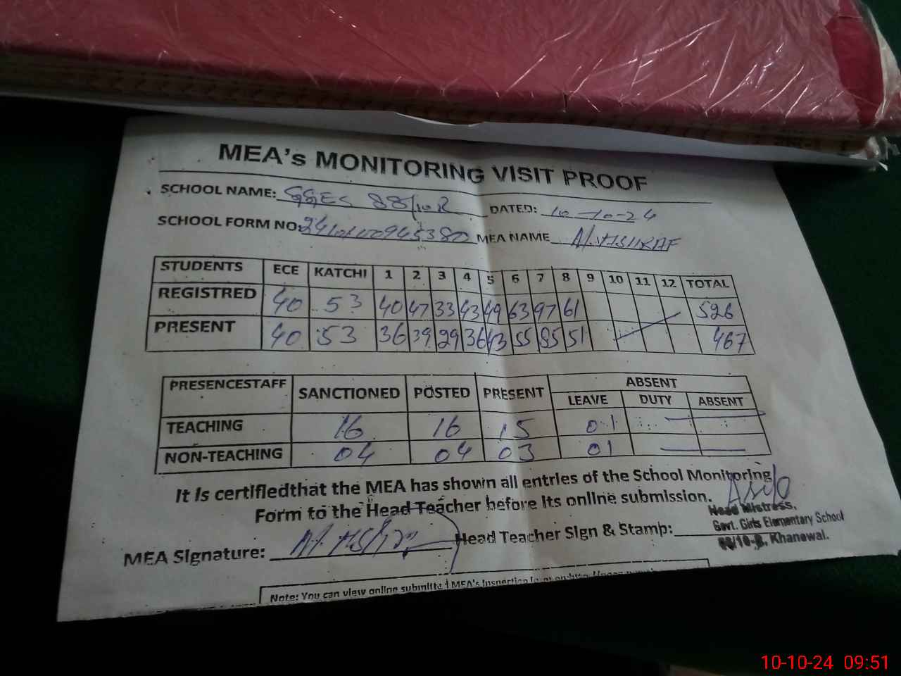 | Attendance Register | Head Teacher | MEA with School | Visit Proof |