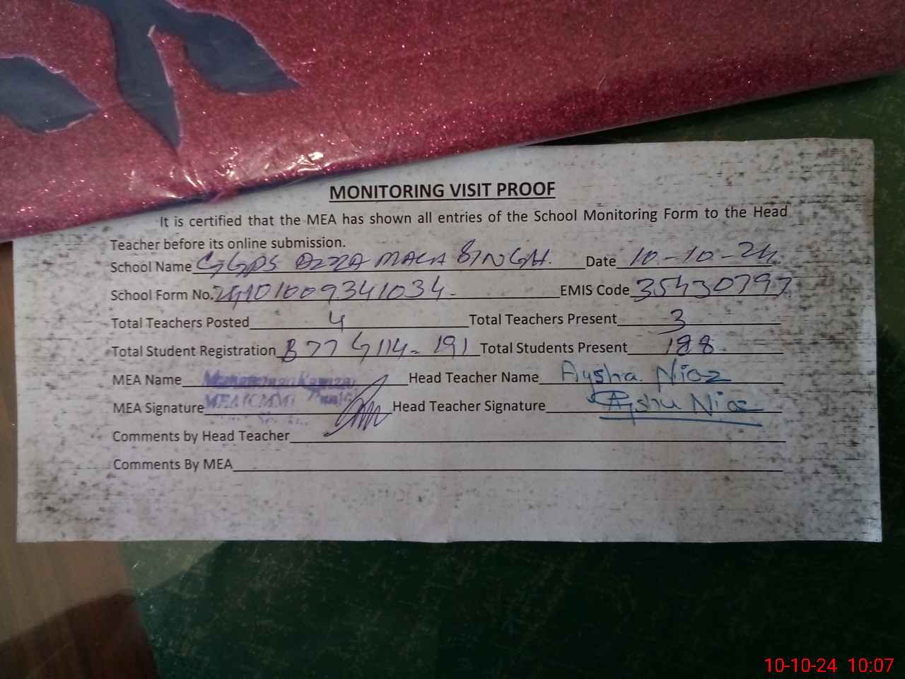 | Certified that this School was Inspected by the Undersigned MEA/DMO Today and the Information Stated Above is as Per Record. | |||||