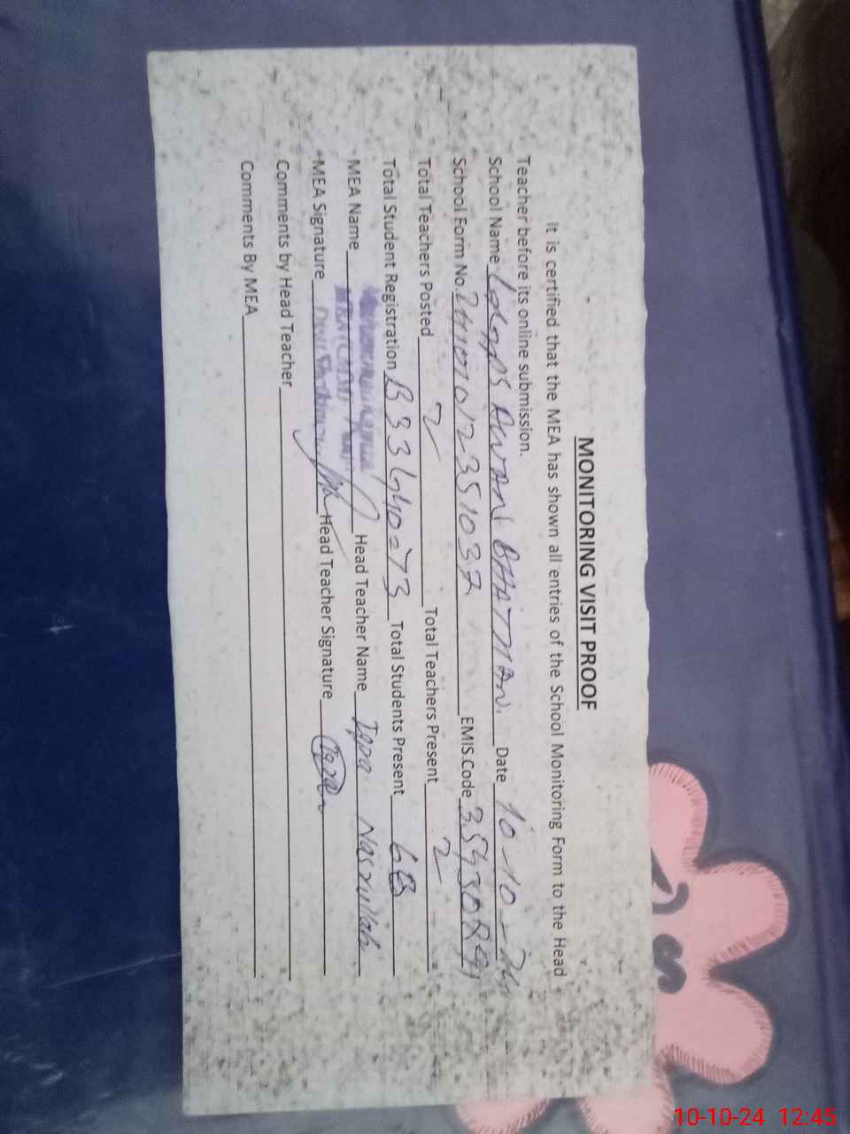 | Attendance Register | Head Teacher | MEA with School | Visit Proof |