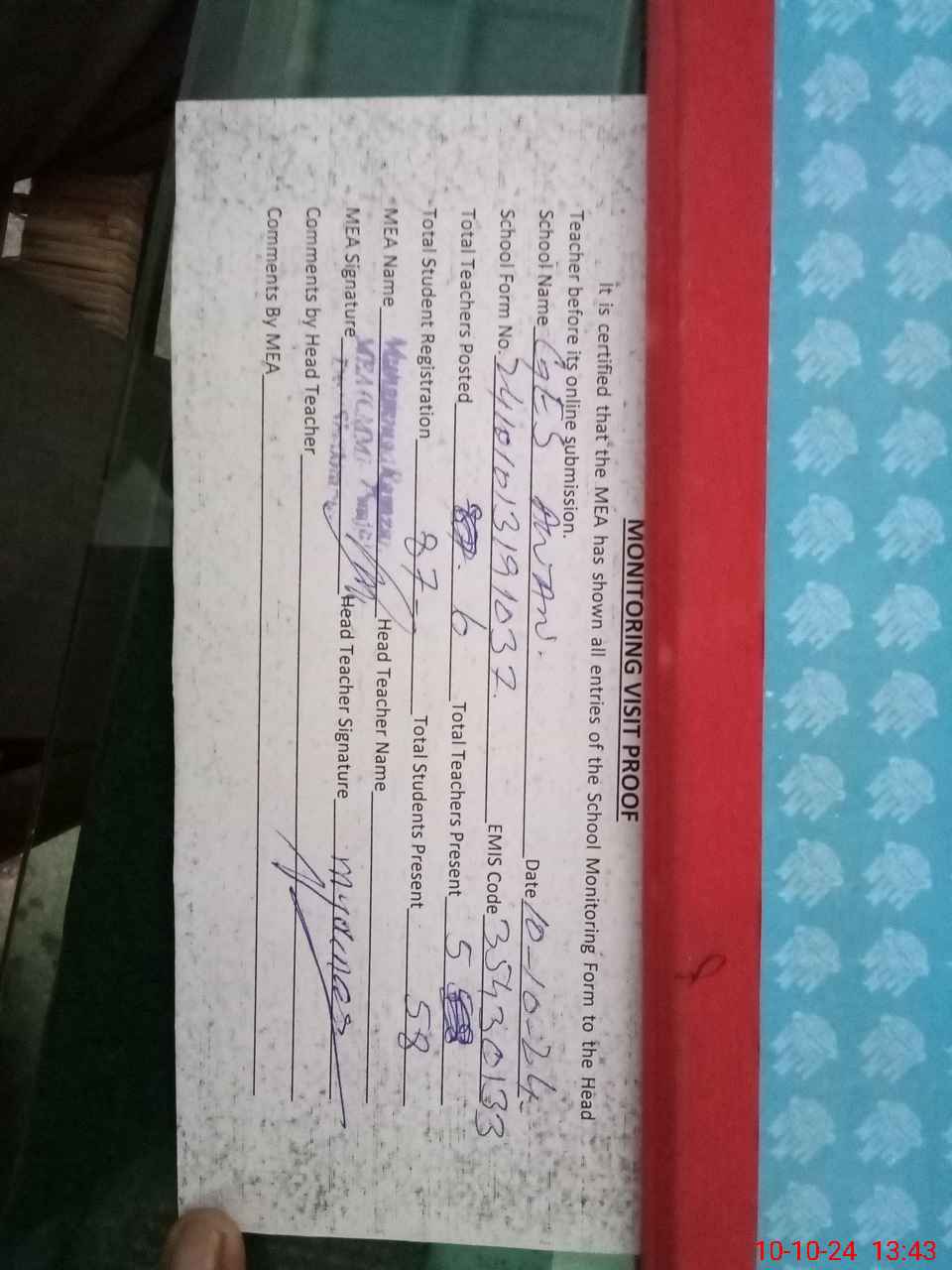 | Attendance Register | Head Teacher | MEA with School | Visit Proof |