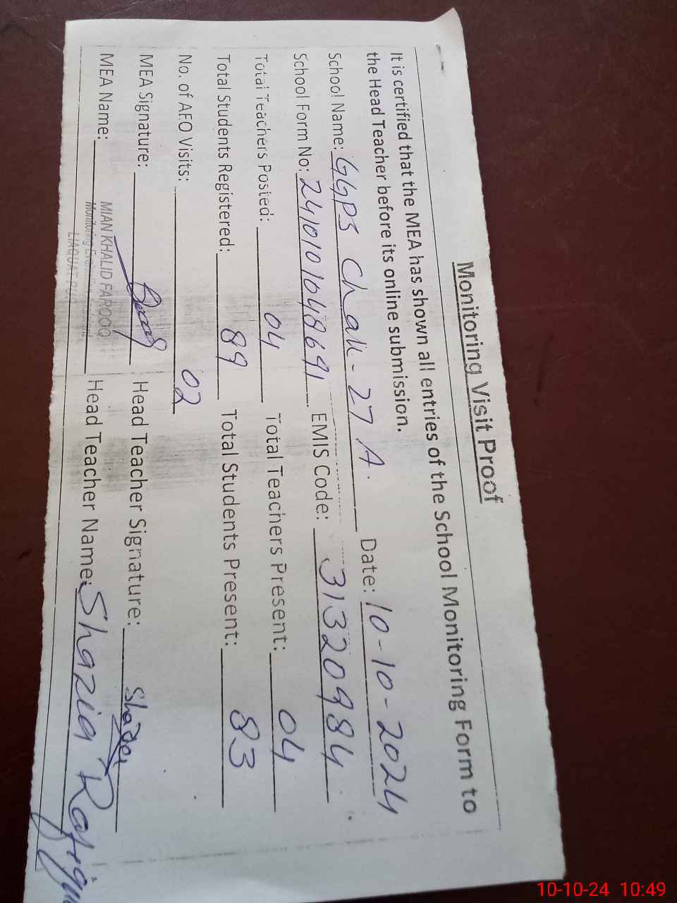 | EMIS Code: 31320984 | Name of School: GGPS CHAK 27/A | |||