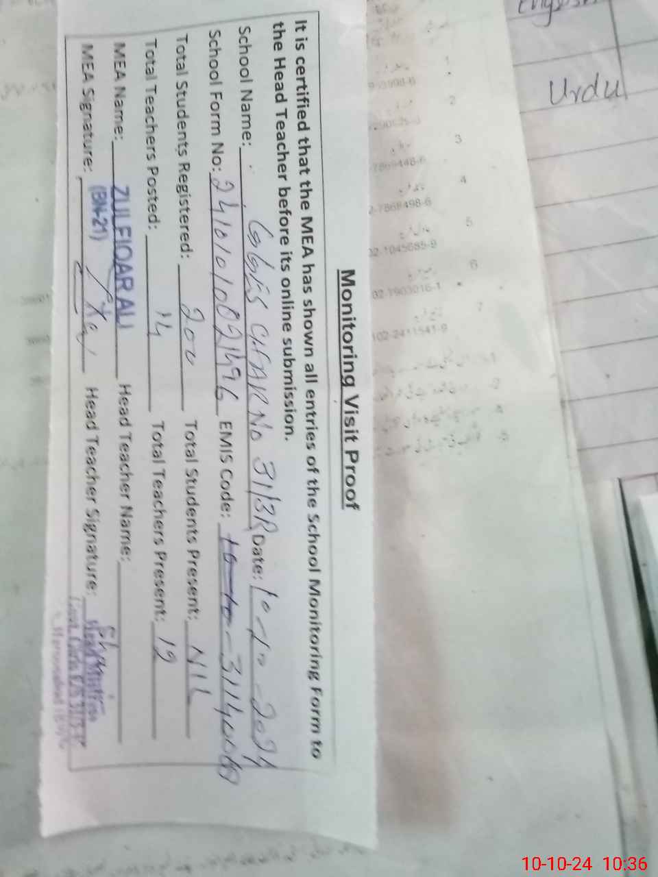 | Attendance Register | Head Teacher | MEA with School | Visit Proof |