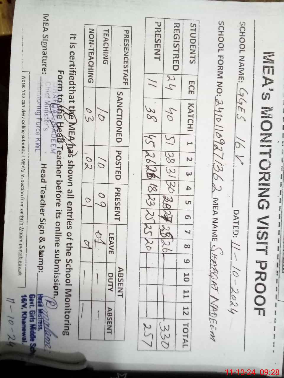 | Attendance Register | Head Teacher | MEA with School | Visit Proof |