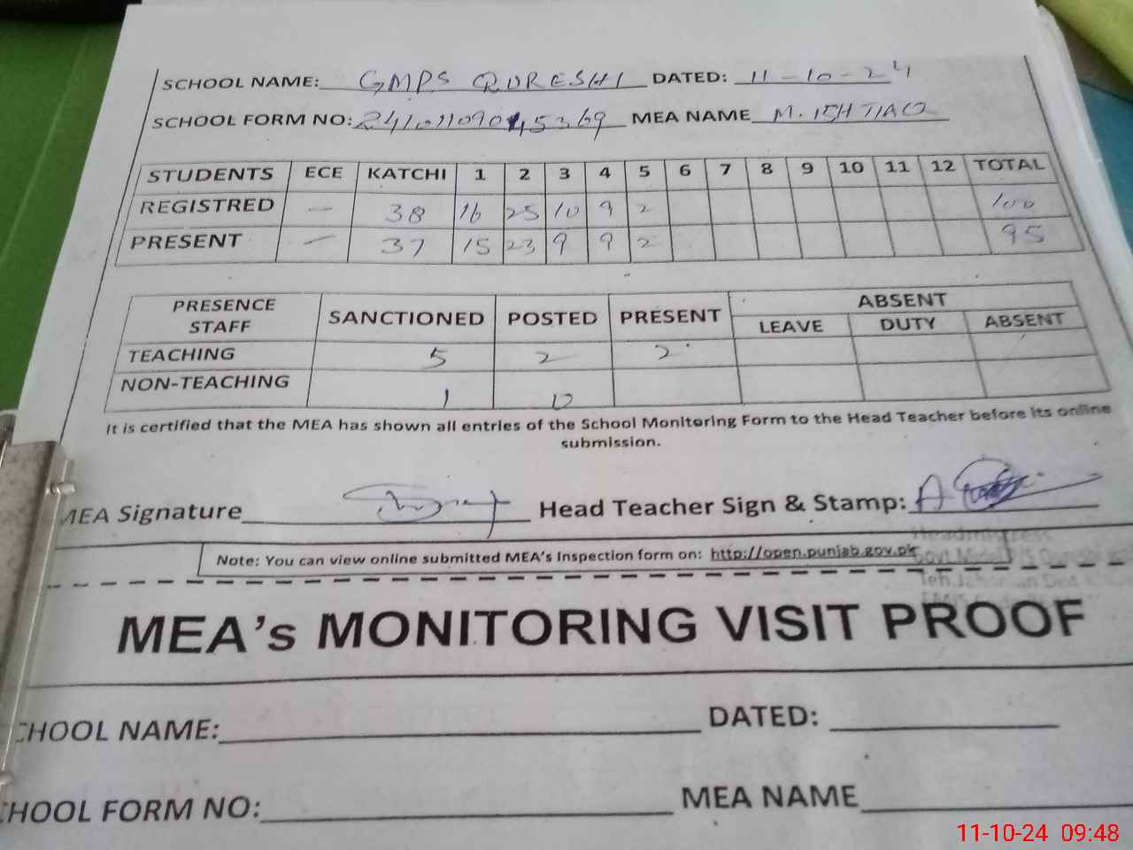 | Attendance Register | Head Teacher | MEA with School | Visit Proof |