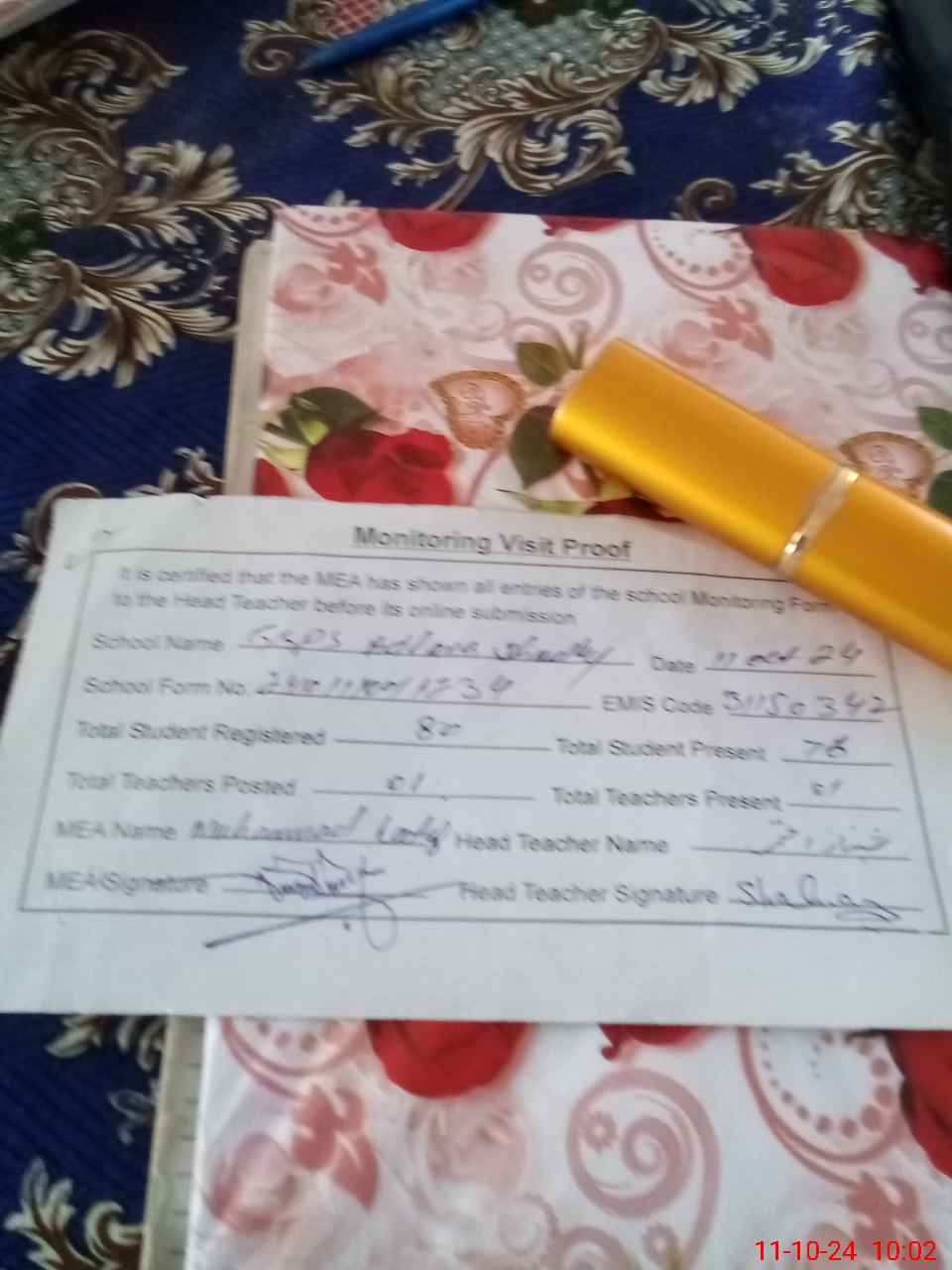 | Attendance Register | Head Teacher | MEA with School | Visit Proof |
