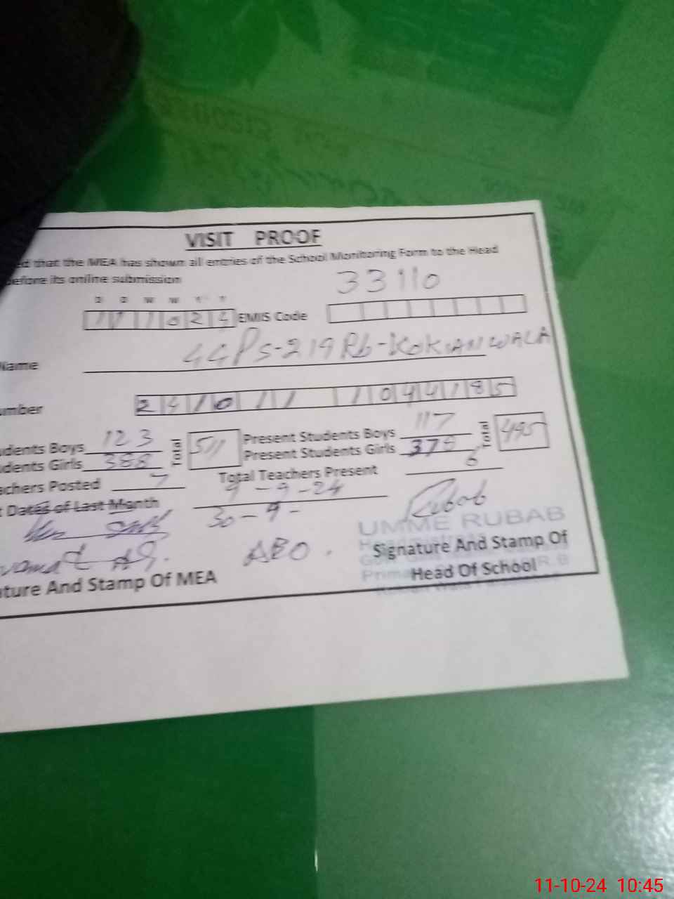 | Attendance Register | Head Teacher | MEA with School | Visit Proof |