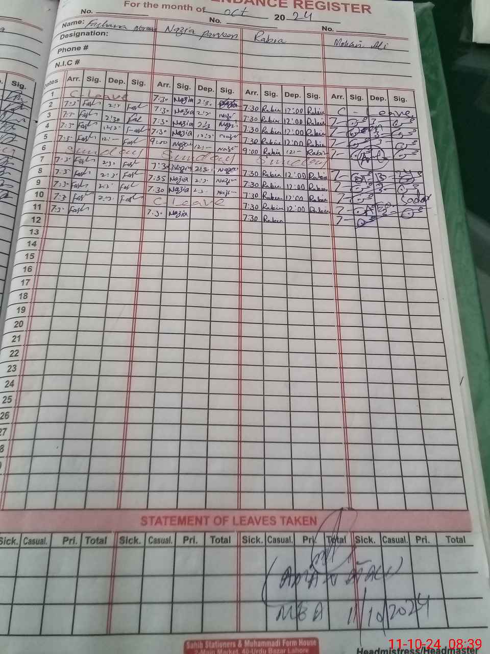 | CNIC | Full Name | Designation | R/C | Absence During Last Calender Month |