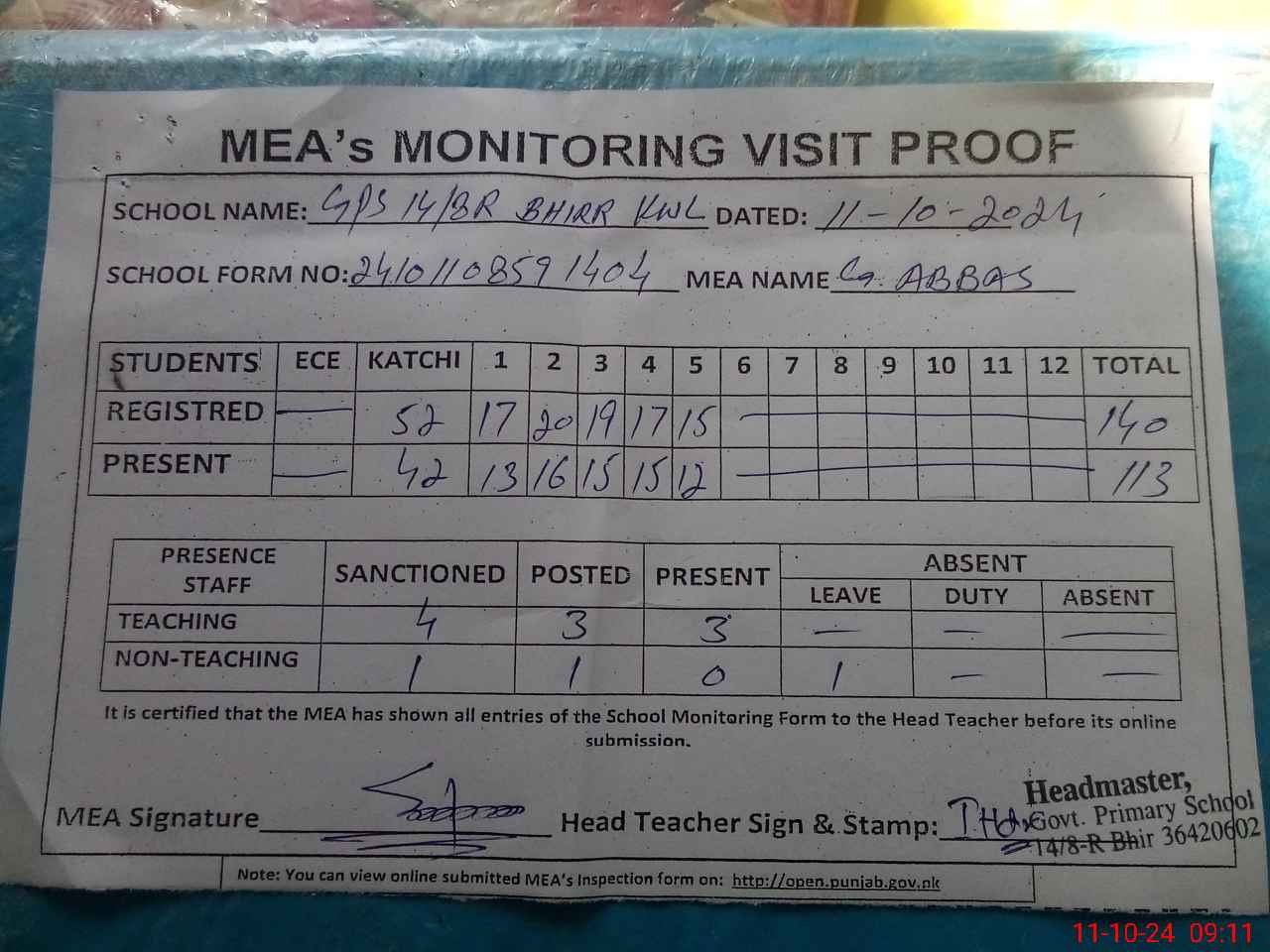 | Attendance Register | Head Teacher | MEA with School | Visit Proof |
